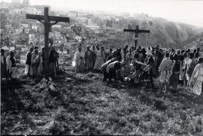 Jézusnak a zsidó főtanács előtti kihallgatása távolról van ábrázolva, senkinek nem látjuk az arcát, csak a szöveget halljuk. A keresztút kezdete mozgalmas, Jézus támolyog a kereszt súlya alatt, Mária hasztalan próbál Fia közelébe jutni, a katonák durván ellökik. Később lelassul minden, az ábrázolás stilizált lesz, drámai feszültséget keltve, hogy aztán a keresztre szegezéstől kezdve ismét felgyorsuljon minden. A kamera egészen közelről mutatja a római katonák szenvtelen arcát, amint beleverik a szögeket Jézus tenyerébe, s ugyancsak premier plánban látszik Jézus fájdalomtól eltorzult arca a kereszten. Máté evangéliumával szemben, Pasolini filmjében Mária is ott látható a keresztfa alatt, János apostollal együtt. Arcán mérhetetlen fájdalom, szinte őrjöngve fogadja Fia halálát.