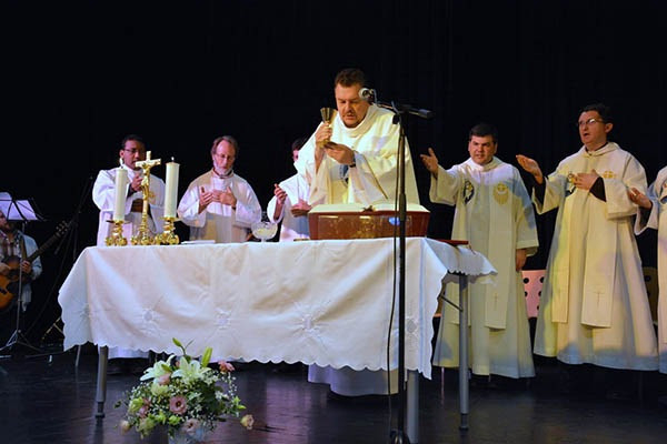 Az ünnepséget a mostoha időjárás miatt a Klebelsberg Kultúrkúriában kezdték szentmisével, amit Ábrahám Béla tartományfőnök mutatott be rendtársaival, a zenei szolgálatot az Eucharist zenekar látta el.