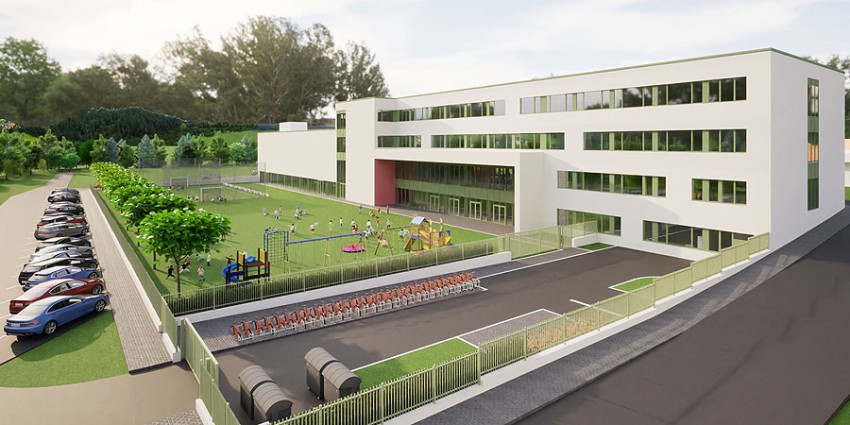 A négyszintes, 16 osztályos általános iskola modern vonalakat követő, visszafogott, a városképbe illeszkedő épület lesz. A gyerekek a félig a talajba süllyesztett legalsó szintről közelíthetik meg az udvart, ahol füvesített labdarúgópálya is helyet kap az udvari játékok mellett. Az épület akadálymentességét lift is szolgálja majd. Az iskolával egybeépítve tornacsarnokot is létesítenek.