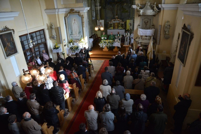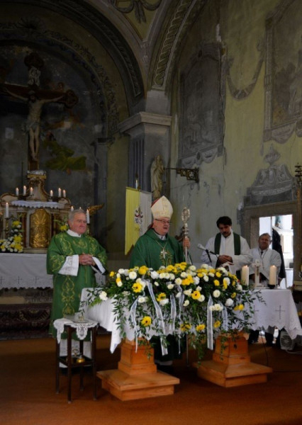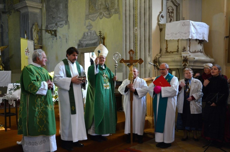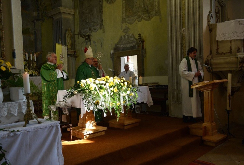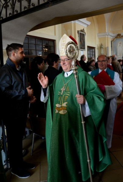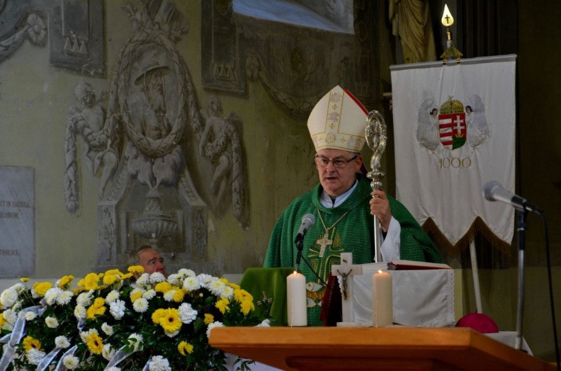 A szentmise kezdetén Tallér Krisztián plébános köszöntötte a főpásztort és a megjelenteket, és örömét fejezte ki, hogy hosszú évek elmúltával ismét püspöki szentmise lehet a templomban. Visszatekintett a török időkben leégett, hányatott sorsú épület történetére, amelynek helyén már 1335-ben állt plébániatemplom. Elmondta, hogy a leromlott állapotú templomot négy pályázat segítségével újították fel: kicserélték a teljes tetőszerkezetet, az elektromos hálózatot, valamint kiépítették a villámvédelmet. Pályázaton nyert összegből valósult meg a nyílászárók cseréje, az épület szigetelése, idén pedig a homlokzat újulhatott meg. Jövőre további pályázatok útján parkolók épülnek, és megerősítik a támfalat is.
