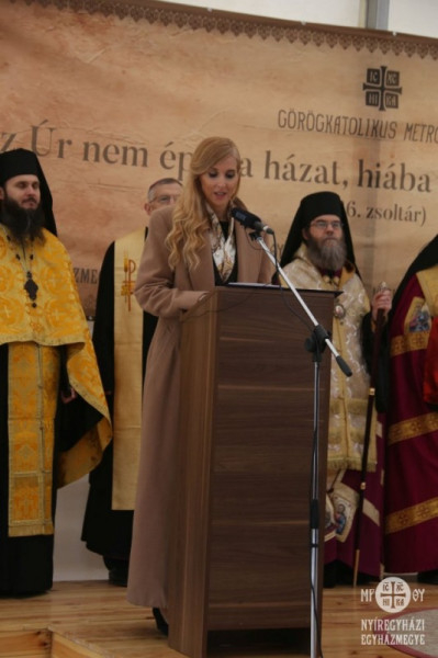 A Szent Damján Kórus rövid műsora után Szabó Tünde sportért felelős államtitkár köszöntötte az egybegyűlteket. Úgy fogalmazott, „a hit megvallása az egyik legszemélyesebb közösségi ügy”, ezért épülnek templomok, ezért támogatja az egyházi intézmények fejlesztését a kormány. A görögkatolikusság és Nyíregyháza város történetének összefonódását idézte fel, mely körülbelül 70 évvel ezelőtt kezdődött, amikor adományokból és az itteni összefogás erejéből főiskolát állítottak fel, Dudás püspök pedig lakosztályát ajánlotta fel a papnevelő intézet számára.