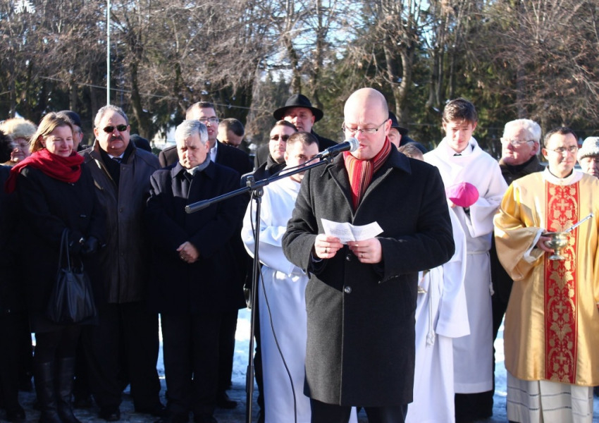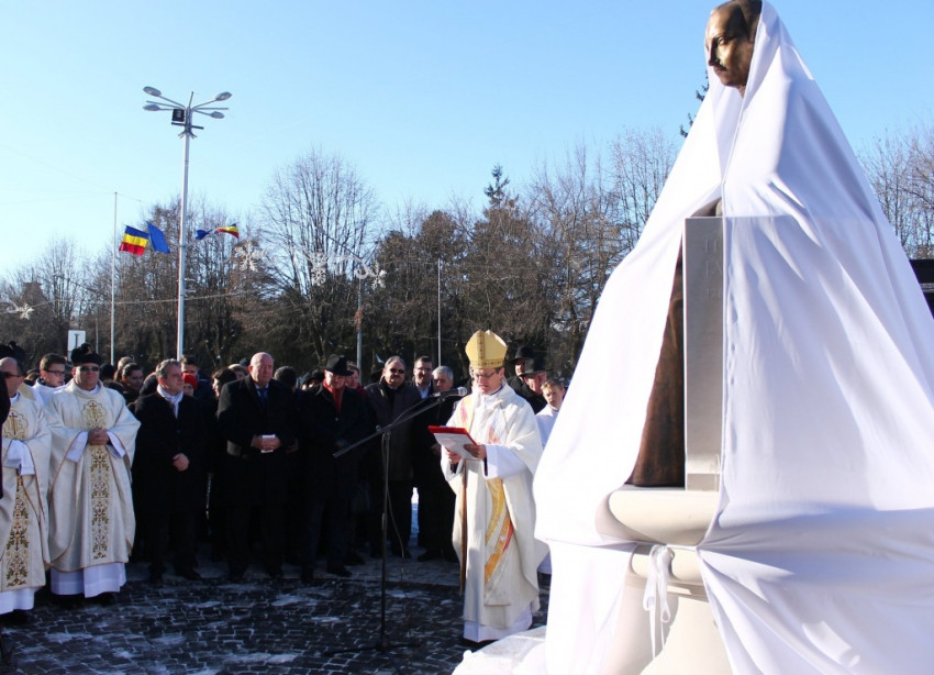 Ezt követően az ünneplő közösség a székesegyház főbejárata elé vonult, ahol Maskulik Dávid, a Hám János Római Katolikus Teológiai Líceum 11/b osztályos tanulója verset szavalt, majd további beszédek hangzottak el Dorel Coica polgármestertől, Tilki Attilától, Szabolcs-Szatmár-Bereg megye országgyűlési képviselőjétől, Hegedűs Csillától, az RMDSZ nőszervezetének alelnökétől, Pataki Csaba szenátortól és Kereskényi Gábor képviselőtől. Ezután áldotta meg Schönberger Jenő püspök az új szobrot, majd koszorúzással és a Hám János-líceum kórusának énekével ért véget az esemény.