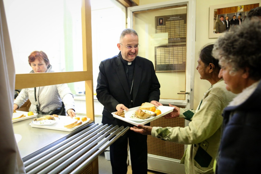 A kereszt megáldása után következett a szegények ebédje, melyet Pintér Gábor nuncius nyitott meg és szolgált fel. Belarusz apostoli nunciusa, aki egy Kecskeméthez közeli településről, Csépáról származik, nem először járt a Karol Wojtyła Barátság Központban: részt vett például 2016. december 24-én is az intézmény által ellátottak karácsonyán, ahol az ételosztásban segédkezett, előadást tartott, és el is beszélgetett a rászorulókkal. Pintér Gábor elárulta, mindig is szívügyének tekintette a rászorulókkal való foglalkozást, hiszen a szegénységnek európai gondolkodással felfoghatatlan formáival találkozott diplomáciai szolgálata során Haitiban, Bolíviában és a Fülöp-szigeteken.