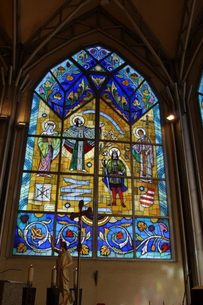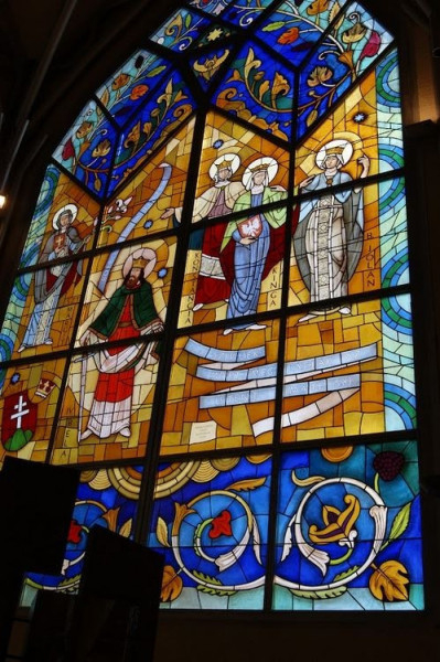 A Magyar Köztársasági Arany Érdemkereszttel kitüntetett Bráda Tibor művész készítette el az alkotásokat, amelyek a magyar szent családokat kívánják a 21. század embere elé állítani. Az alkotó feleségével, Deák Ilona festőművésszel és művész lányaikkal monumentális művészi munkát valósítottak meg a már behelyezett három szentélyablakon.