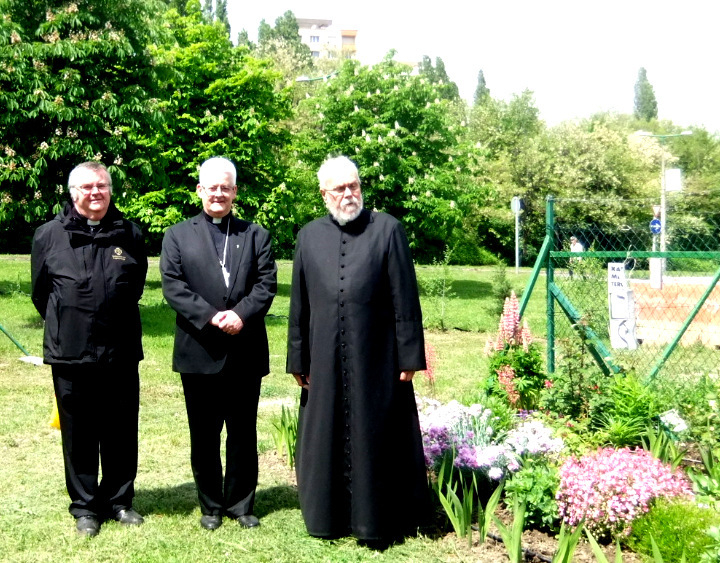 Az ünnepi szentmise után Spányi Antal megyéspüspök, Baltási Nándor plébános és Kristofory Valter esperes megtekintették a hittanosok által gondozott kertet.