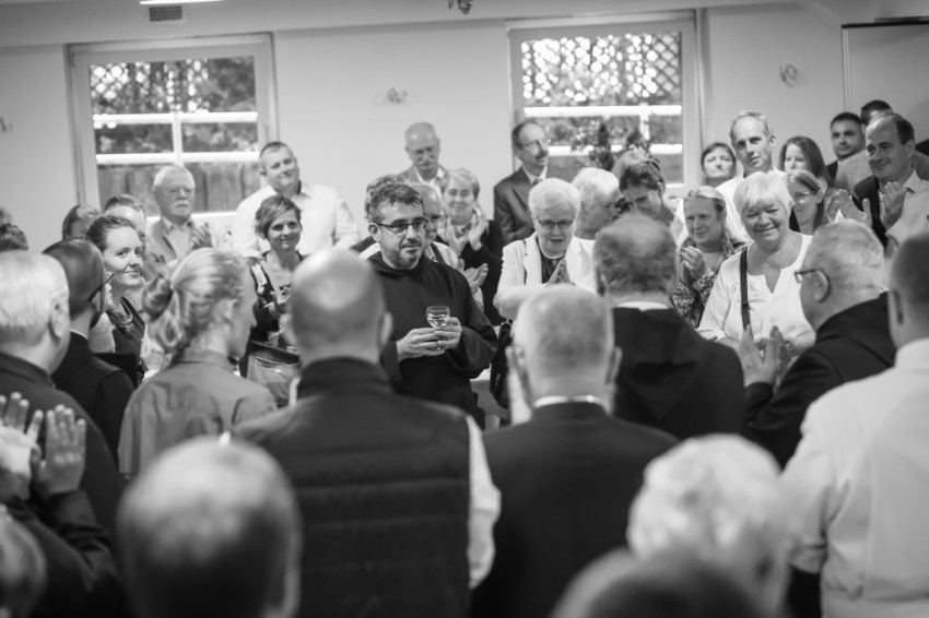 A szabinás hívek, közösségek, „a házhoz tartozó világiak” nevében Schubert Tamás hitoktató, a Szent Imre-gimnázium magyartanára szólt, aki hálát adott ezért a helyért, melyből fényt és táplálékot merítenek oly sokan, s köszönetet mondott azoknak, akik ezt elősegítik, elsősorban Fehérváry Jákó OSB házfőnöknek, kápolnaigazgatónak. Utalt Jákó atya nem kis szerepére a pannonhalmi bazilika felújításánál, ami után nem is tűnt olyan nagy falatnak a tanulmányi házé... Majd Thészeusz hajójáról mesélt, amelyet sokáig mutogattak az athéniak az arra vetődő idegeneknek; közben mindig újabb és újabb deszkák korhadtak el a hajóból, melyeket ki kellett cserélni – míg végül eljött az a pillanat, hogy az újabb idegenek megkérdezték: Ez tényleg Thészeusz hajója? – és az athéniek elbizonytalanodtak...