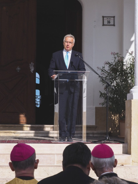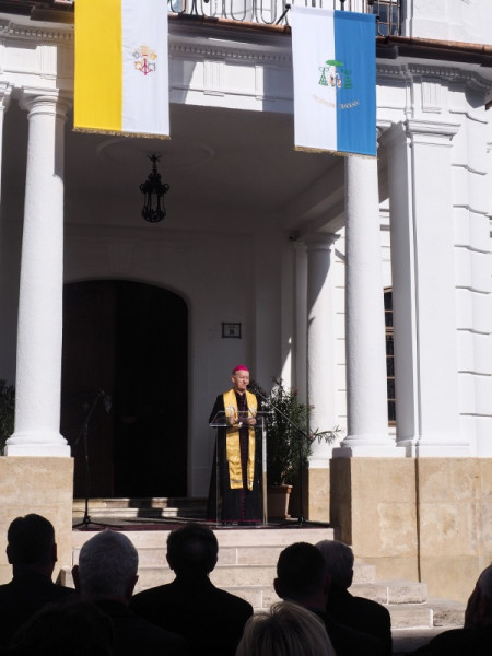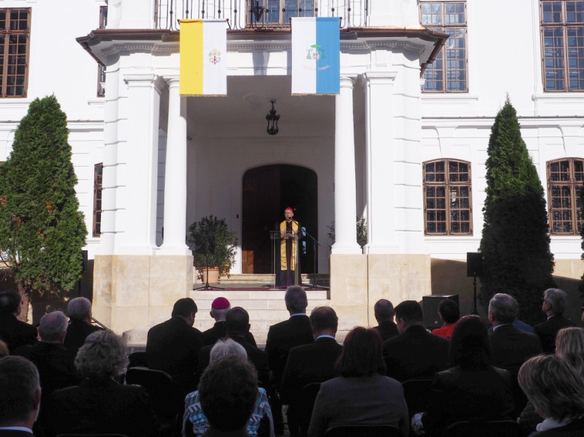 Ez volt az egyik első és legnagyobb egyházmegye Szent István idejében. A mindenkori veszprémi főpásztor otthona az ország egyik legszebb barokk épülete – fogalmazott Semjén Zsolt. Hangsúlyozta, hogy az ehhez hasonló, kiemelt nemzeti értéket is képviselő épületek fenntartása nem várható el pusztán a hívektől. A miniszterelnök-helyettes kiemelte, hogy az Európai Unióban a magyar kormány fordítja arányaiban a legtöbb pénzt az egyháztámogatásra.