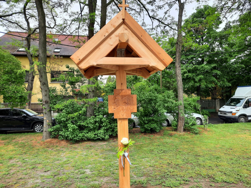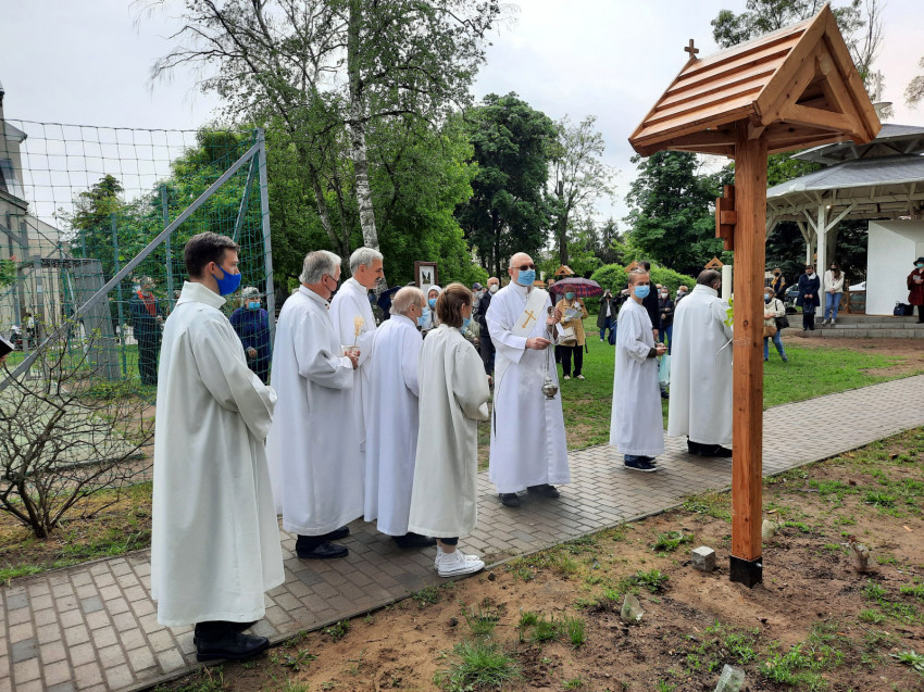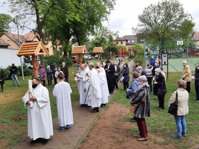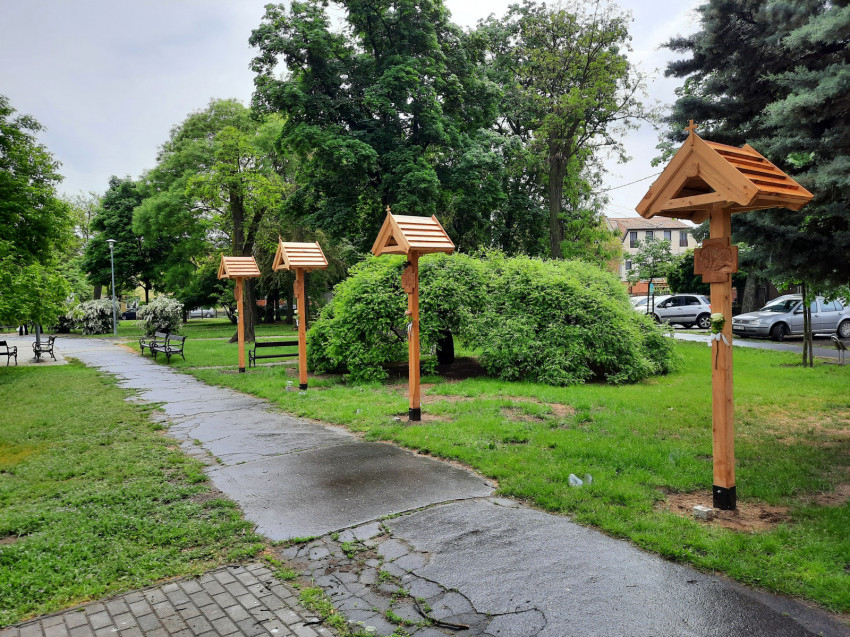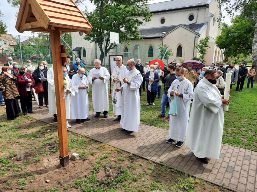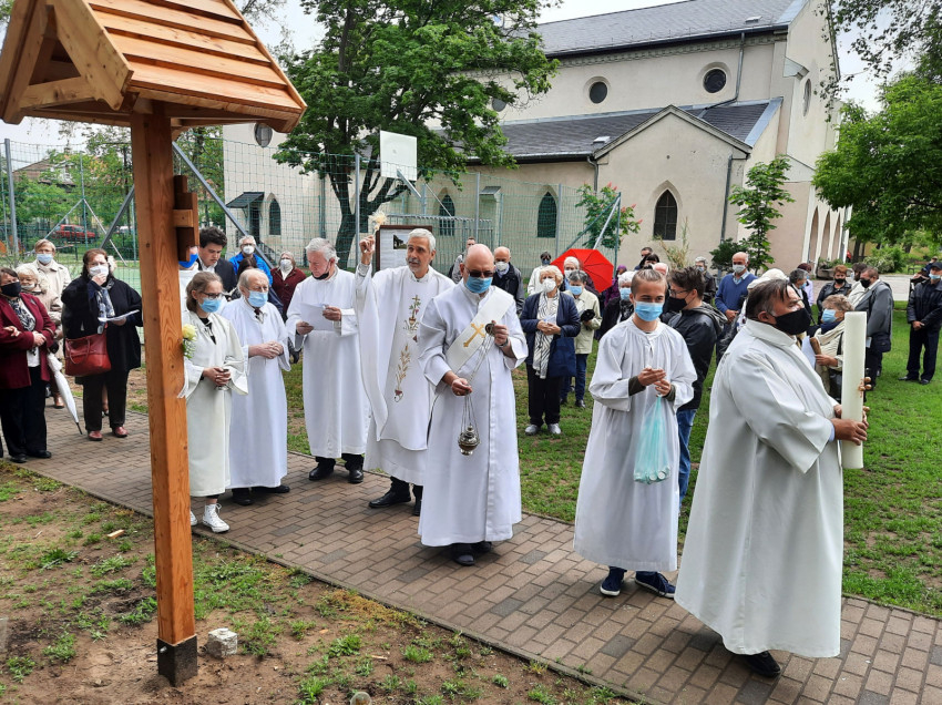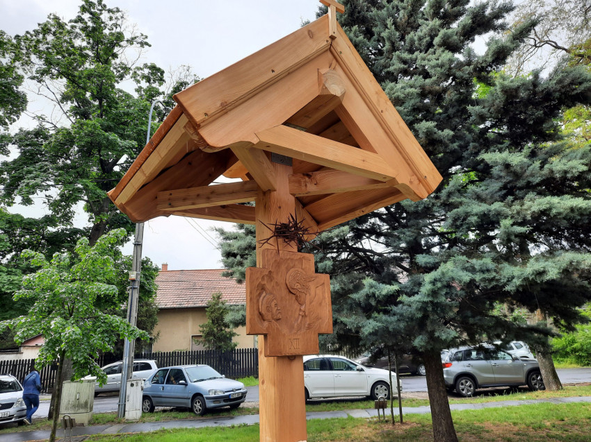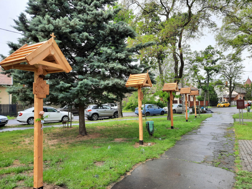 A fából készült képeket fatetőcskével védett oszlopokra tették, az így elkészült keresztúti stációk pedig a plébánia kertjében kaptak helyet. Urunk mennybemenetelének ünnepén keresztútjárás során áldotta meg őket Almásy Tamás plébános. Az oszlopokat Márk Gergely rózsanemesítő növényeivel díszítették.