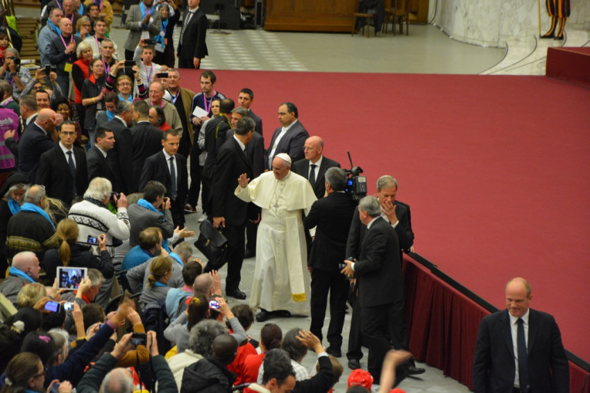 Az Európa különböző országaiból, valamint Dél-Amerikából érkezett zarándokok, többségükben hajléktalan emberek a VI. Pál teremben találkoztak először Ferenc pápával november 11-én.