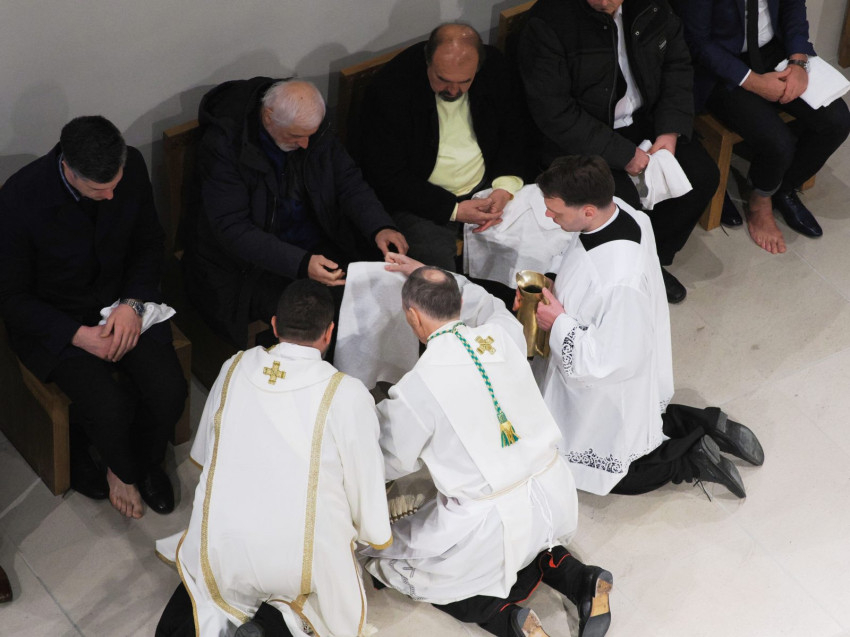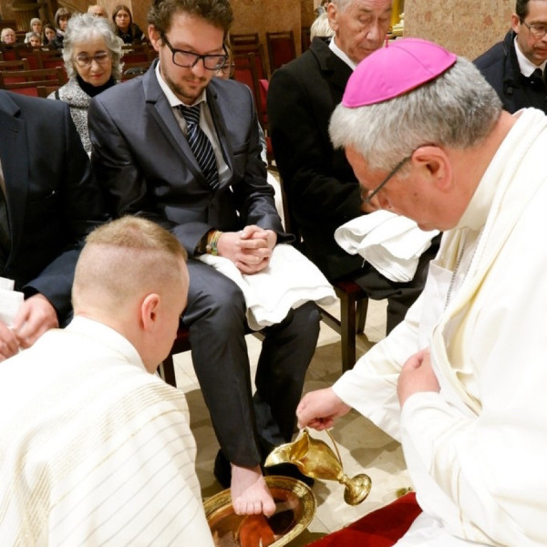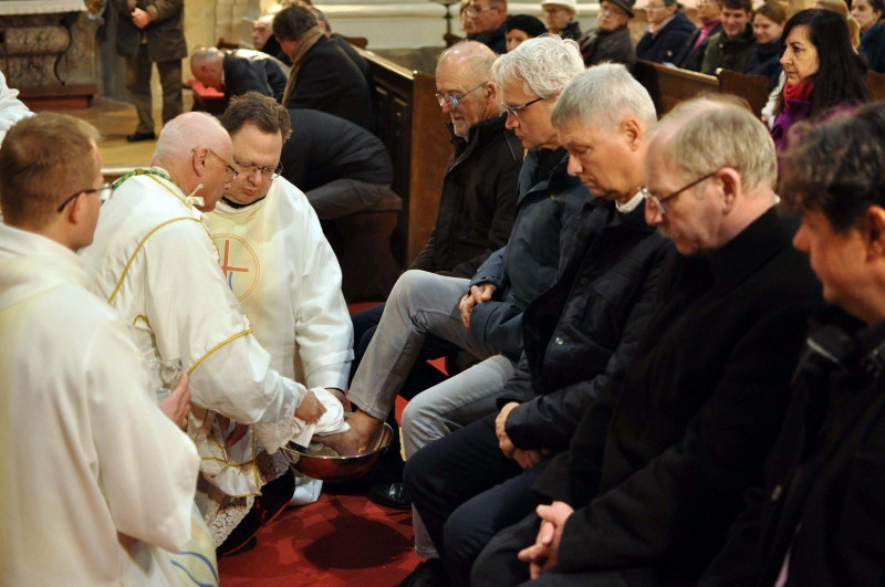 A homíliát követően a szertartást végző segédpüspök a hagyományokat követve megmosta tizenkét, a közösséghez tartozó és erre előzetesen kiválasztott férfi lábát.