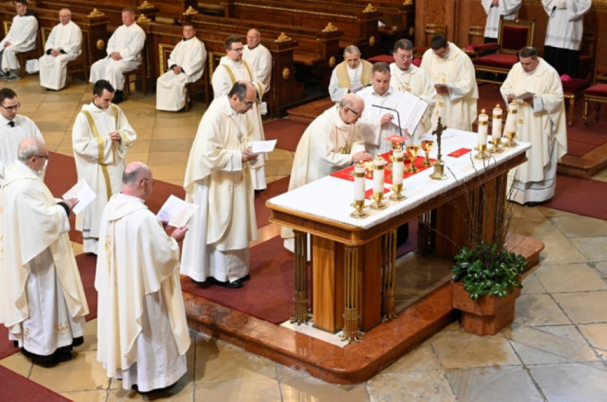 Erdő Péter bíboros, prímás mutatott be szentmisét március 28-án, nagycsütörtökön este az esztergomi bazilikában, és tizenkét hívő, köztük az esztergomi Érseki Papnevelő Intézet három papnövendékének mosta meg a lábát.