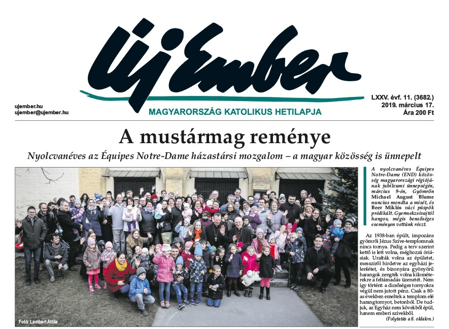 A címoldalon kezdődik tudósításunk a családokból és papokból álló nyolcvanéves Équipes Notre-Dame (END) közösség magyarországi régiójának Gyömrőn tartott jubileumi ünnepségéről. Michael August Blume nuncius volt a szentmise főcelebránsa, a homíliát pedig Beer Miklós váci megyéspüspök mondta. A gyömrői plébániára Dóka Tamás plébános hozta az END közösséget három évvel ezelőtt, ma már hét csoport működik. A lelkipásztor hangsúlyozza: a családegyház korát éljük, a kisközösségekét, és nem a nagy tömegekét.