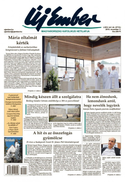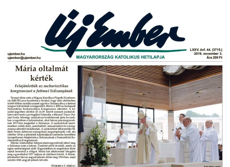 A címlapon kezdődik tudósításunk a fatimai nemzeti zarándoklatról, amelynek keretében Palánki Ferenc debrecen-nyíregyházi megyéspüspök október 28-án a Jelenések kápolnájánál szentmise keretében ünnepélyesen felajánlotta a Szűzanyának a 2020-ban Budapesten megrendezendő 52. Nemzetközi Eucharisztikus Kongresszust.