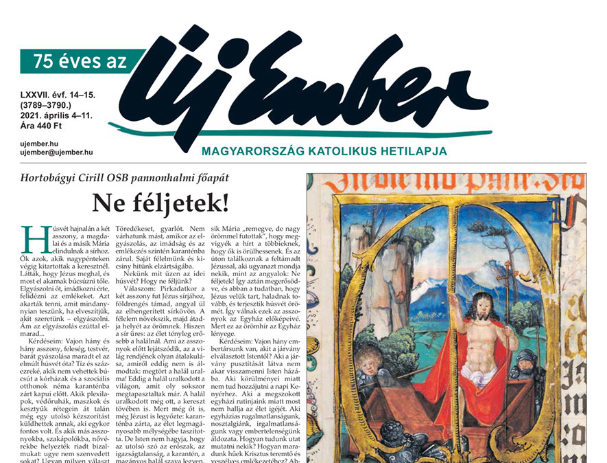 Húsvéti dupla számunkban Hortobágyi Cirill OSB pannonhalmi főapát mai világunkról, mai aggodalmainkról ír vezércikkében. Mégis biztat: „A húsvéti evangéliumban a félelem átadja helyét az örömnek. Most felénk is kiáltja az angyal: Ne féljetek! Krisztus feltámadt, és ő velünk van, velünk lesz ezután is. Isten új egének és új földjének a kapuja feltárul: Jézus lép át rajta, és velünk együtt, általunk akar új arcot adni a teremtett világnak. Arra bátorít, hogy járjunk magabiztosan és emelt fővel.”
