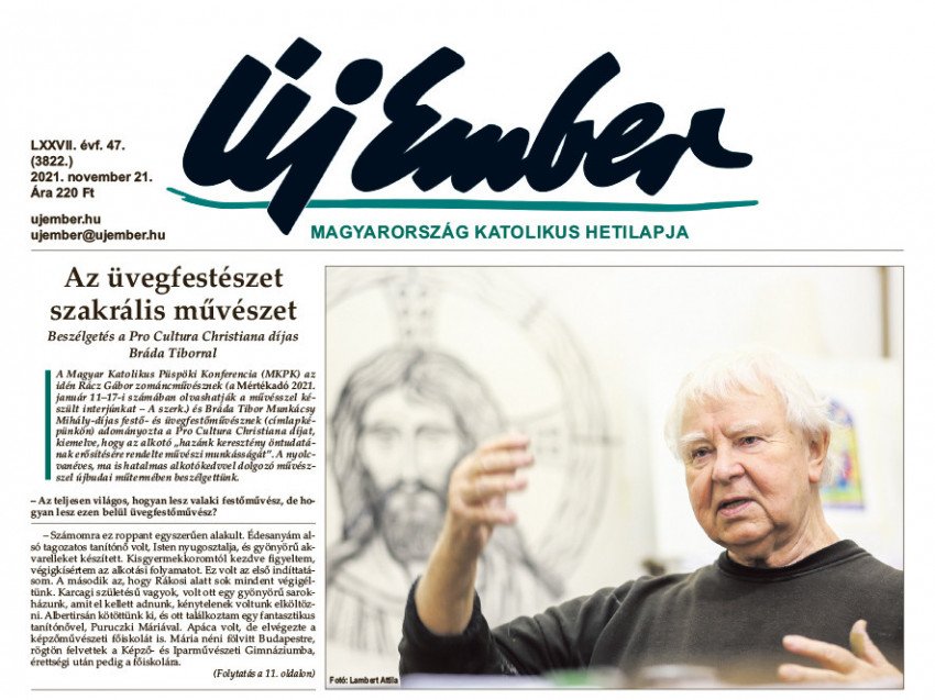 A Magyar Katolikus Püspöki Konferencia (MKPK) az idén többek között Bráda Tibor Munkácsy Mihály-díjas festő- és üvegfestőművésznek adományozta a Pro Cultura Christiana díjat, kiemelve, hogy az alkotó „hazánk keresztény öntudatának erősítésére rendelte művészi munkásságát”. A nyolcvanéves, ma is hatalmas alkotókedvvel dolgozó művésszel újbudai műtermében beszélgettünk, a vele készült interjúnk a címlapról indul.