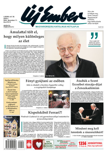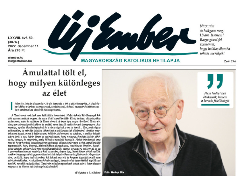 Jelenits István piarista szerzetes 90 éves. Címoldalon kezdődik lapunk vezető anyaga: a Tanár úrral készült születésnapi beszélgetés a pedagógiáról, emberségről, az irodalomról, Isten útjairól, az élet küzdelmeiről is szól.