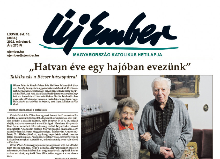 Mostani lapunkban visszatekintünk a nemrég befejeződött házasság hetére, a 8. oldalon egy képes összeállítással, a címoldalról indulóan pedig egy házaspáros interjúval. Bécser Péter és Krisch-Fekete Irén 1961-ben házasodtak össze, tavaly ünnepelték a gyémántlakodalmukat. Életkorukat meghazudtoló frissesség, vidámság, tettrekészség sugárzik belőlük. Két fiuk közül az idősebb ferences szerzetes-pap lett. Az Amoris laetitia-családévben őket is kérdeztük: hogyan sikerült összetartaniuk a családot, és megőrizni egymás között azt a békét és örömet, ami ilyen fiatalon tartja őket.