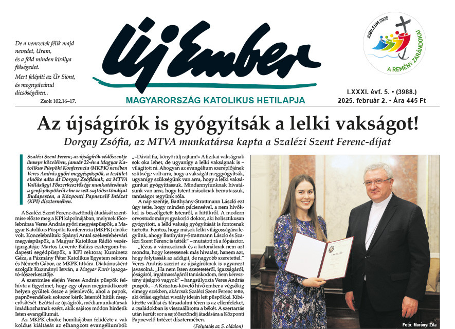 Arról is tudósítunk, hogy átadták a Szalézi Szent Ferenc-sajtóösztöndíjat január 22-én. Az elismerést idén Dorgay Zsófia, az MTVA Vallásügyi Főszerkesztőségének munkatársa kapta. A Magyar Katolikus Püspöki Konferencia (MKPK) nevében Veres András győri megyéspüspök, a testület elnöke adta át a díjat Budapesten, a Központi Papnevelő Intézet (KPI) dísztermében.