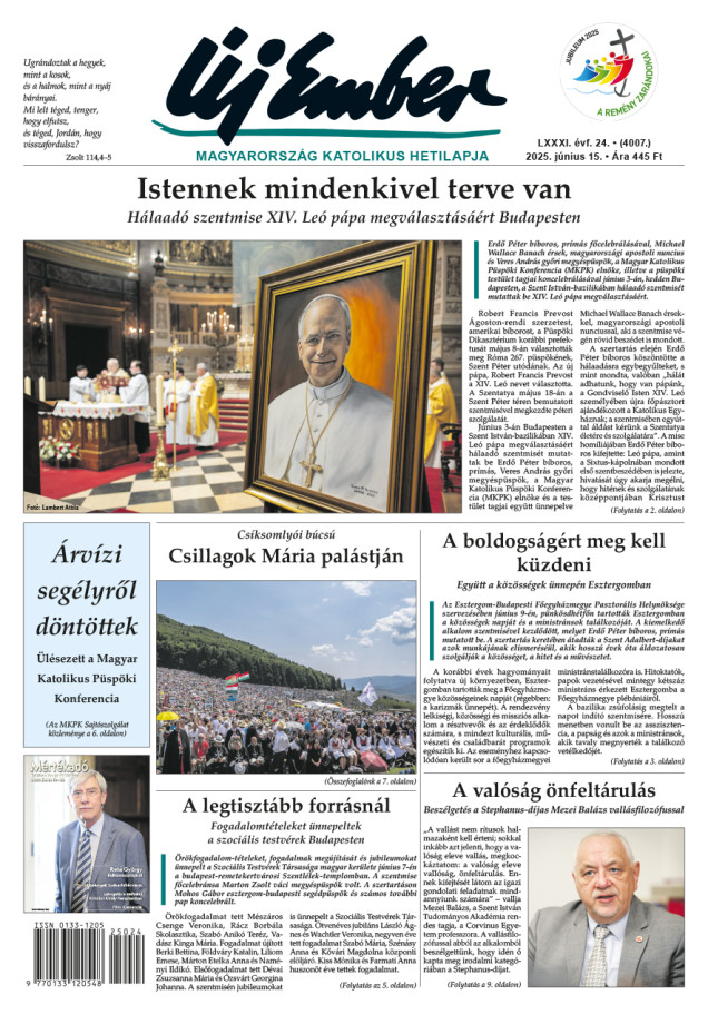 A címlapon kezdődik tudósításunk arról, hogy Erdő Péter bíboros, prímás főcelebrálásával, Michael Wallace Banach érsek, magyarországi apostoli nuncius és Veres András győri megyéspüspök, a Magyar Katolikus Püspöki Konferencia (MKPK) elnöke, illetve a püspöki testület tagjai koncelebrálásával június 3-án Budapesten, a Szent István-bazilikában hálaadó szentmisét mutattak be XIV. Leó pápa megválasztásáért.