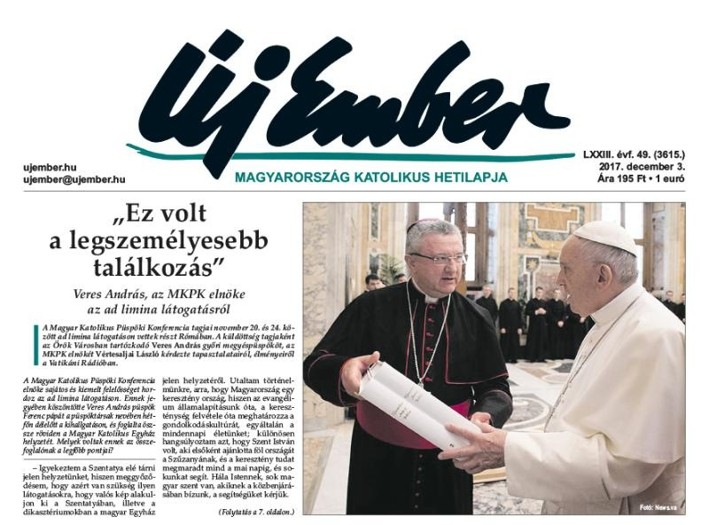 Az Új Ember december 3-i számának címlapján kezdődik a magyar püspökök ad limina látogatásáról szóló összefoglaló interjú Veres András püspökkel, a Magyar Katolikus Püspöki Konferencia elnökével. A november 20. és 24. között zajlott eseménysorozat főbb állomásairól tudósításokat közlünk a 6. és a 7. oldalon.