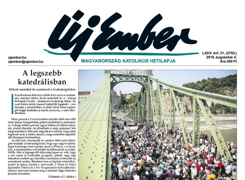 Az Új Ember augusztus 4-i számának címlapján egy különleges képet láthatunk: nagy tömeg áll a Szabadság hídon, autók sehol. Ezúttal nem valamilyen demonstrációra gyűltek össze az emberek, hanem azért, mert Sajgó Szabolcs jezsuita szerzetes három paptestvérével szentmisét mutatott be itt, a „legszebb katedrálisban”. A címlapon egy másik képen is megakadhat a szemünk: népviseletbe öltözött emberek ülnek egy templom padjaiban. Böjte Csaba ferences szerzetes járt a moldvai csángó magyaroknál, ő mutatott be magyar nyelvű szentmisét és mondott szentbeszédet a bákói Szent Miklós-templomban július 28-án.