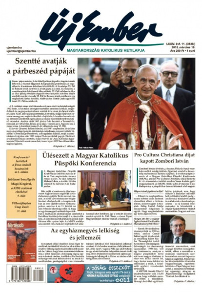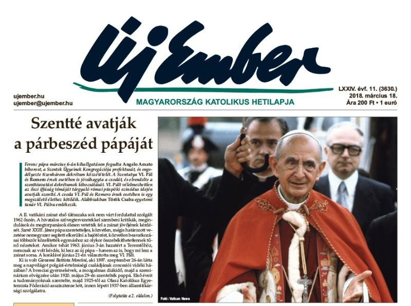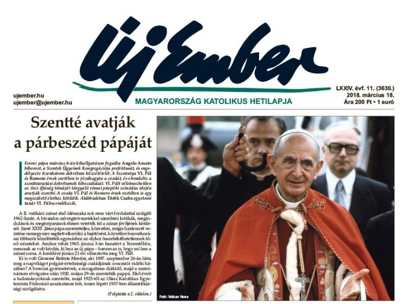 Az Új Ember március 18-i számának címoldalán hírt adunk arról, hogy szentté avatják VI. Pál pápát, vélelmezhetően az őszi püspöki szinódus idején. A párbeszéd pápájára Török Csaba egyetemi tanár emlékezik. Összefoglalót olvashatnak a Magyar Katolikus Püspöki Konferencia üléséről, közöljük Beran Ferenc írását az egyházmegyés lelkiség jellemzőiről, és hírt adunk arról, hogy a püspöki konferencia Zombori István történészt, címzetes főiskolai tanárt Pro Cultura Christiana díjjal tüntette ki.