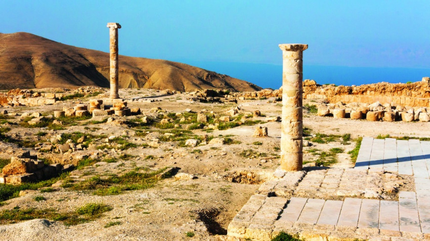 A közel öt méter (475 cm) magas, stukkóborításának részletét őrző ión oszlop az egykori királyi fürdőház négyzetes csarnokában álló tizenkét oszlop egyike volt. Majdnem négyméteres (379,5 cm) dór társa pedig a dór perisztiliumos udvart körülvevő oszlopsor részét képezte. Ott magasodik a fennsík platóján, ahol egykor Heródes Antipász tragikus kimenetelű születésnapi lakomája zajlott. Ahol Salome táncolt, aki anyja, Heródiás ösztönzésére az általa gyűlölt, rabként őrzött „szent ember”, Keresztelő János fejét kérte jutalmul. Oszlopok, messze látszó, hiteles jelek Keresztelő Szent János letisztult golgotáján.