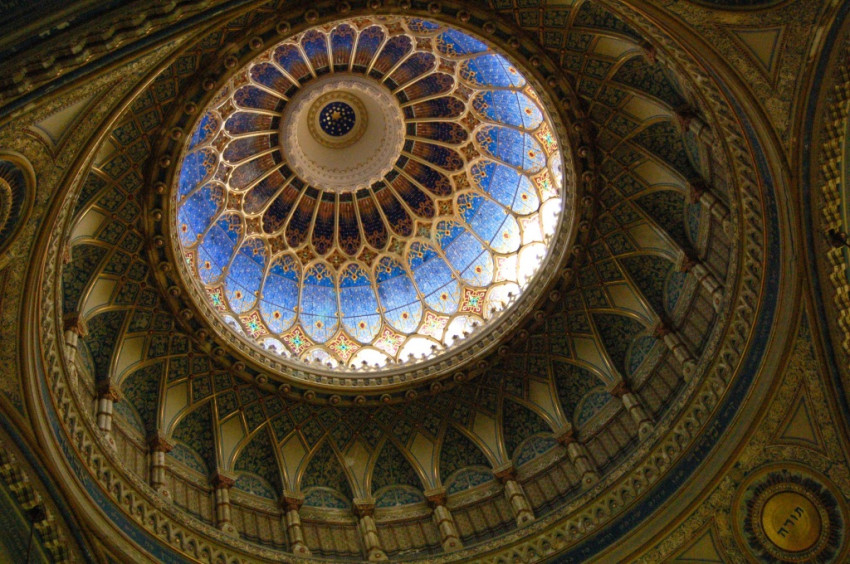 A négy márványoszlop feletti négy héber szó: a tóra, a tanulás és a jótékonyság gyakorlását jelenti, ami a zsidó vallás tanítása szerint az erkölcsi világot meghatározó tényezők. A kupoladob 24 oszlopa a nap 24 óráját, fölötte kék alapon a csipkebokor virágai a hitet jelképezik. A végtelen tér élménye fogalmazódik meg a kupola növényzetét jelző zöldes-barna díszítő sorától egyre sötétedő csillagos, kék üvegburkolatban. Középütt a csillagos ég a Dávid csillaggal, körülötte a nap kivilágítható sugarai koronázzák meg az égboltot. Az üvegkupola és valamennyi ólomüveg ablak Roth Miksa alkotása. A zsinagógában 1340 ülőhely van.