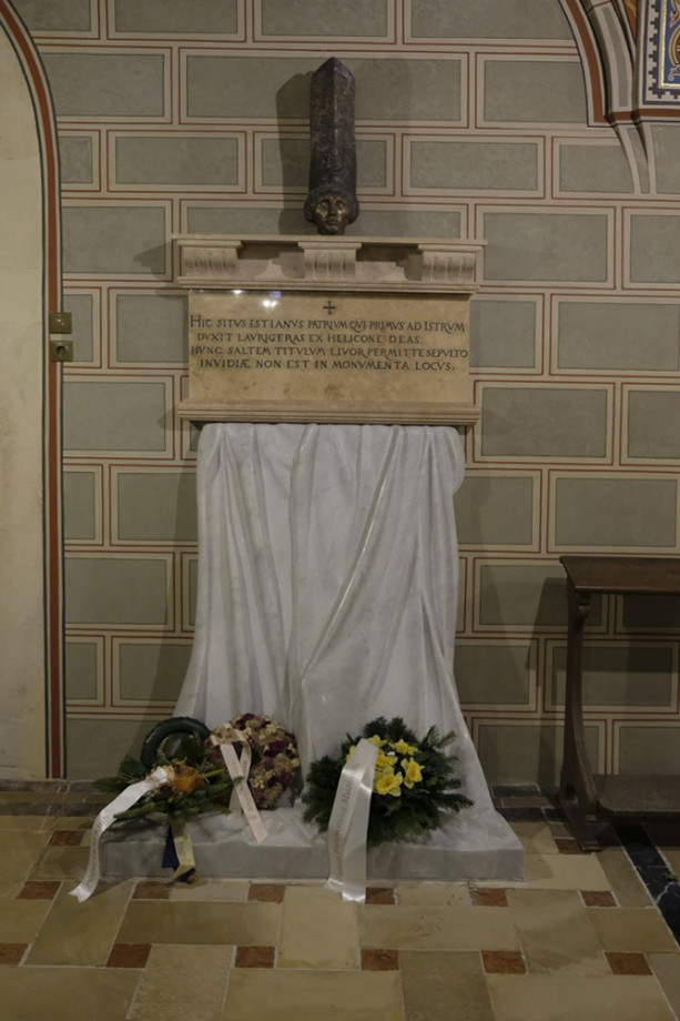 Janus Pannoniust, III. János pécsi püspököt, a nagy humanista költőt 2008. október 21-én szentmisével egybekötött szertartás keretében temették újra a Pécsi Székesegyház altemplomában. Fakoporsóját Dulánszky Nándor püspök nyughelye mellé helyezték. Síremléke – egy carrarai márványból faragott, földre hulló lepel a költőt ábrázoló bronz fejszoborral – Rétfalvi Sándor szobrászművész alkotása.