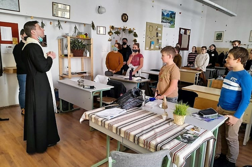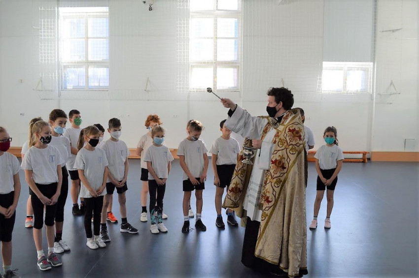 A liturgia után a gyerekek az óvoda és az általános iskola elé vonultak, ahol Tamás atya megszentelte az épületeket.