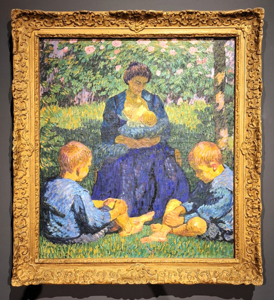 „A művészet számomra valóban olyan, mint egy elveszett paradicsom” – írta Albert Anker 1853-ban. A kiállítás első termeiben elsősorban az ő festményeivel találkozhatunk. Az indítókép azonban Giovanni Giacometti műve, az Anyaság (1908), amely talán az egész tárlat emblematikus alkotása lehetne. Álomszerűen derűs, napsütötte, virágos kertben ül egy anya három gyermekével. A bájos jelenetben aranysárga színek keverednek sárgászöldekkel, a háttérben rózsaszín virágok. A festmény valóban jól kifejezi a kiállítás címét: mintha csak földi paradicsomban járnánk.