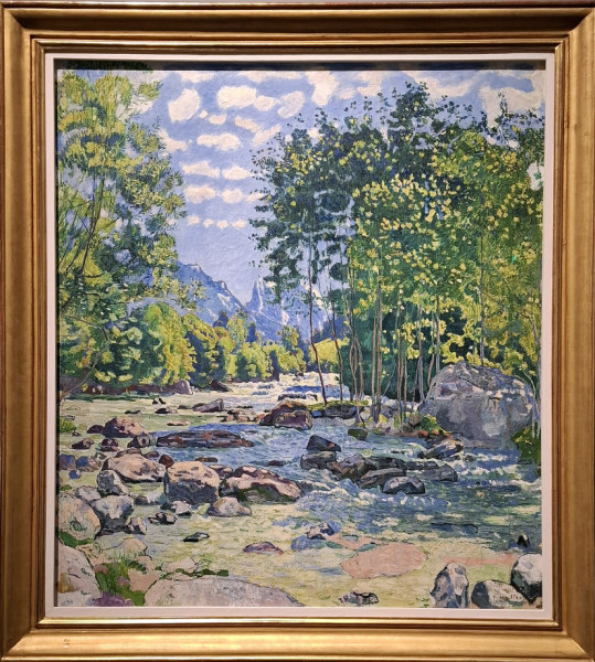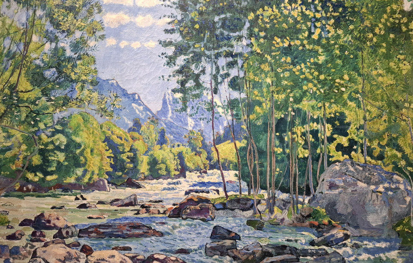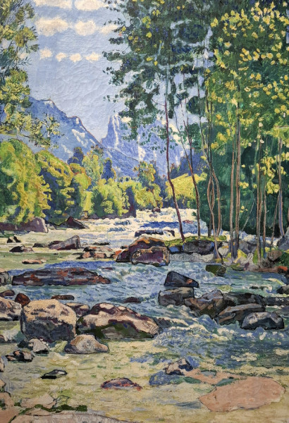 Ezt a folyóparti tájat 1905-ben festette Hodler Svájcban, Leissigen közelében. A folyó medre az előtérben a kép teljes szélességét elfoglalja, a sajátos nézőpont-választásnak köszönhetően a közel 3690 méter magas Wetterhorn szinte jelentéktelennek tűnik a háttérben, a lombok között. Az égboltot kisebb-nagyobb bárányfelhők tarkítják, még barátságosabbá téve ezt a nyári, alpesi hangulatú tájképet. Ferdinand Hodler legtöbb tájképe azonban nem ilyen derűs, hanem inkább furcsa, sokszor komor, nem éppen életvidám hangulatú alkotás. A néző nagyon is magányosnak érezheti magát az általa festett ember nélküli tájban. Hodler a századforduló szecessziós, szimbolista korszakának az egyik jelentős képviselője volt, sőt az expresszionizmus előfutára. De ne szaladjunk nagyon előre!