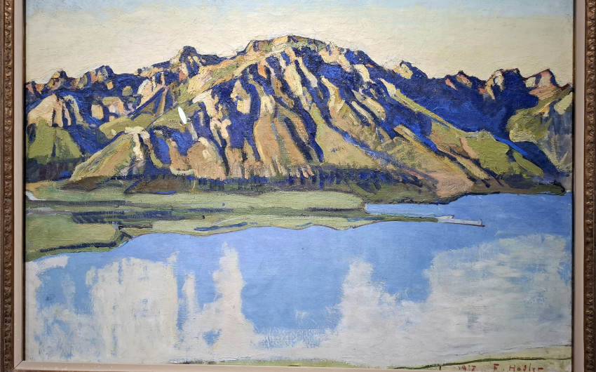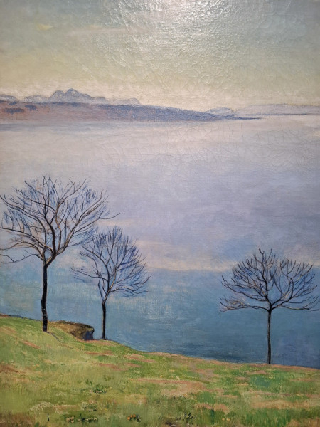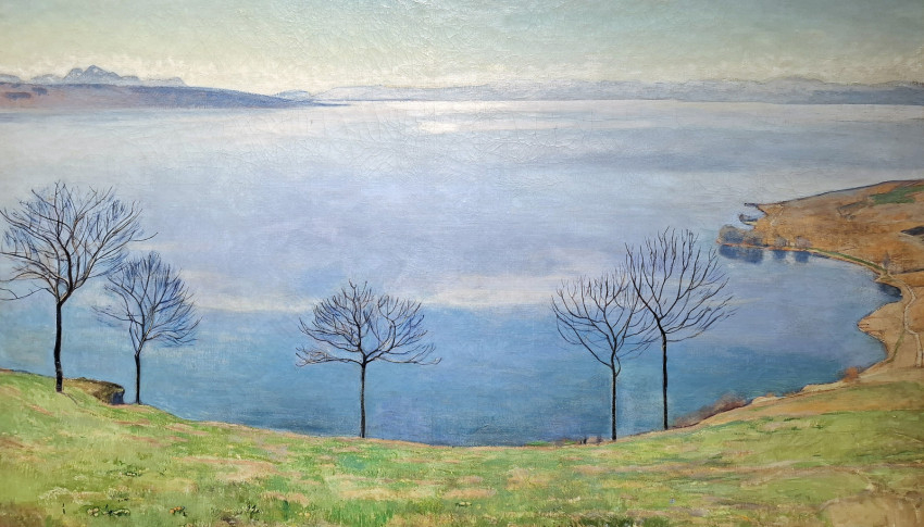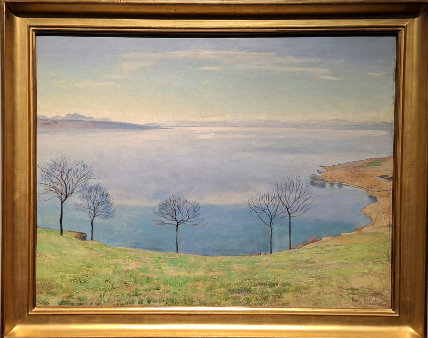 A Genfi-tó öt kopasz fával című képe a legjellegzetesebb műve a mostani kiállításon. A bámulatos érzékenységgel megfestett kép elég nagy méretű, csoda szép kékes, enyhe lilás árnyalatokkal és finom sárgászöldekkel hívja fel magára a figyelmet. Körkörös, vagy inkább, amint az elemzők is írják, elliptikus kompozíció jellemzi, ahogy az előtér zöld partjának íve találkozik az égbolt felhőinek kanyarulatával. Elöl csontvázszerű, kopasz fák koronái segítik belátnunk a teret, egyfajta kapaszkodót adva a szemnek, mielőtt a nagy tó túlsó partjára érne a tekintetünk. A kép valóban rendkívüli, de egyúttal van benne valami nyomasztó is, mint a legtöbb Hodler- mesterműben. Hasonló hatást kelt Az Eiger, a Mönch és a Jungfrau című festmény is, ez sem csak egy „egyszerű” tájkép. A vászon kétharmadát ködtenger uralja, mintha sohasem akarna feloszlani, a hófödte csúcsok csak a háttérben mutatják meg magukat. A kiállításon a következőket olvashatjuk Hodler tájképeiről: „Az emberi alakot száműzi a tájaiból. Ezzel egy időben a civilizációra vonatkozó mindennemű utalást is elhagyja képeiről, sem alpesi falvak, vasútvonalak vagy hegyi menedékek, sem tehéncsordák nem kapnak helyet a tájaiban. Az emberi alak mint anekdotikus jelentőségű, járulékos elem mellőzésével tájképei a fenséges transzcendens élményét hordozó, ikonikus tárgyakká válnak.” Maga Hodler pedig így fogalmazta meg ars poeticáját: „A művész feladata, hogy megragadja a természet végtelenségét, a szépséget, és abból kivonja a lényeget.”