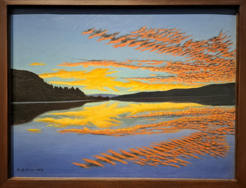 Muszáj néhány szót ejtenünk Adolf Dietrich Esti hangulat az Unterseenél című művéről is, ami teljesen más, mint az eddig látott képek. Erős vörösessárgák és kékek uralják a vásznat, s expresszív módon ábrázolják a naplementét. Dietrich számára az önkifejezés fontosabb a transzcendenciánál.