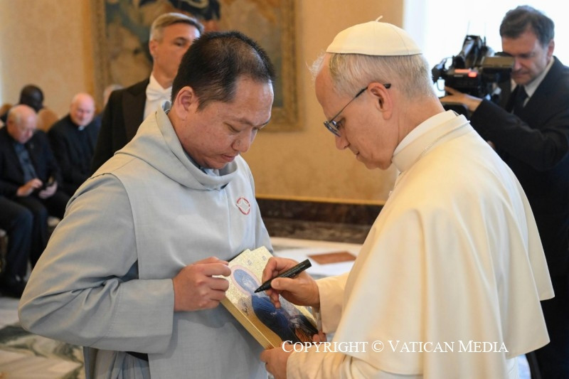 „Béke legyen veletek!” – köszöntötte a Szentatya a Konzisztórium teremben összegyűlt vendégeket, külön kiemelve az egyes káptalanokon most megválasztott új legfőbb rendi elöljárókat, és kérte: „imádkozzunk az Úrhoz a rendi közösségekért és minden megszentelt személyért, hogy bármely szerzetes intézmény tagjai – mindenekelőtt és egyedül Istent keresvén – a kontemplációt, mellyel szívvel-lélekkel hozzá kapcsolódnak, kössék össze az apostoli szeretettel, mellyel a Megváltó művéhez csatlakoznak és Isten országát akarják terjeszteni” – idézett Leó pápa a II. Vatikáni Zsinat Perfectae caritatis kezdetű konstitúciójából.