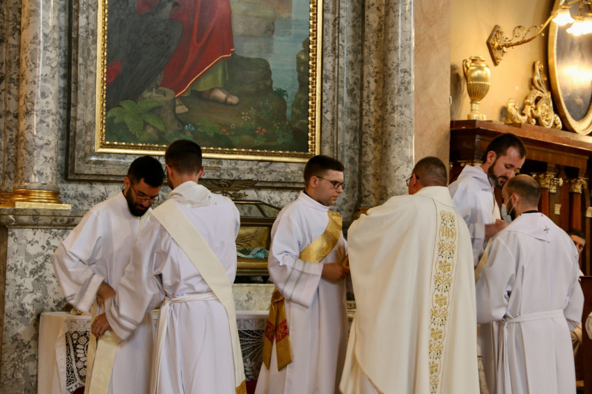 A Mindenszentek litániájának elimádkozását követően a püspök szerpappá szentelte Tempfli Mátét, Bîndăroi Alexandru Irimiat és Perez Gutierrez Pablot. A felszentelt diakónusok felöltötték magukra a (szerpapi módon viselt) stólát és dalmatikát, majd a főpásztortól átvették az evangéliumos könyvet, jelezvén, hogy a szentelésben hatalmat kaptak Isten igéjének hirdetésére.