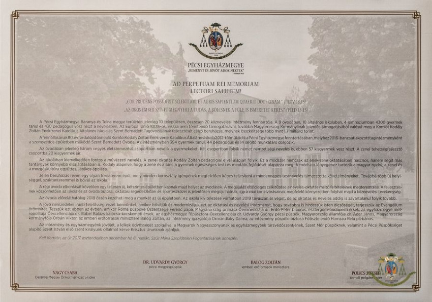 A Pécsi Egyházmegye fontosnak tartja, hogy minden Baranya és Tolna megye területén élő család számára biztosítsa a katolikus nevelési intézmények választásának lehetőségét. Komló Baranya megye egyik járási székhelye, a járás területén több mint 35 ezer ember él. A városban és a járáshoz tartozó tizenkilenc településen élő gyermekek számára a keresztény értékrendű nevelés már óvodás kortól biztosított. Számos generáció nőtt fel úgy, hogy erre nem volt lehetősége, hiszen Komlón és a környező településeken korábban sehol nem működött egyházi nevelési intézmény. Bár a munkálatok az óvodában csak 2018 őszére, az iskolában 2019 tavaszára fejeződnek be, ezalatt az intézményben az oktató-nevelő munka zavartalanul folytatódik.