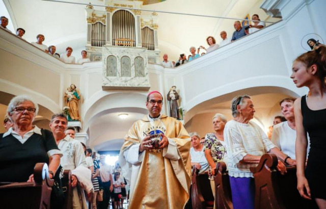 Ünneplőkkel telt meg az olaszfai templom augusztus 20-án délután. Székely János püspök mutatott be szentmisét; a liturgia magyar és olasz nyelven zajlott.