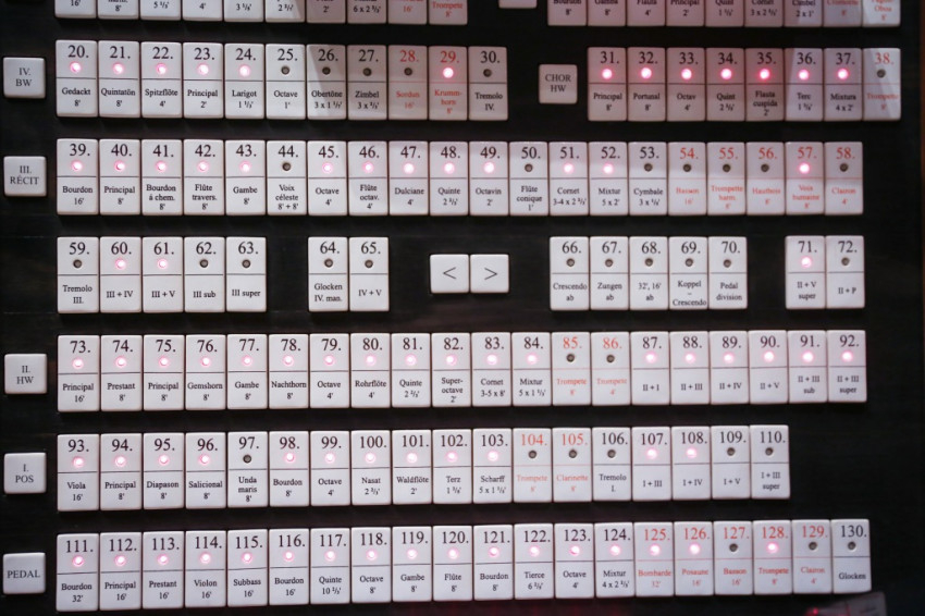 A 111 regiszter összesen 7771 sípot és 18 csőharangot foglal magában. Az orgonaművész segített elképzelni a 111 regisztert: olyan, mintha egy 111 tagú zenekar játszana. Elmondta továbbá, hogy a legnagyobb síp 10,6 méter hosszú. Hozzátette, hogy ilyen hosszú síp nem fér el a rendelkezésre álló térben, ezért a hosszabb sípok fel vannak tekerve, mint egy kürt. A legnagyobb sípokba egy kisgyerek beleférne; míg a legkisebb sípok 8 milliméteresek.