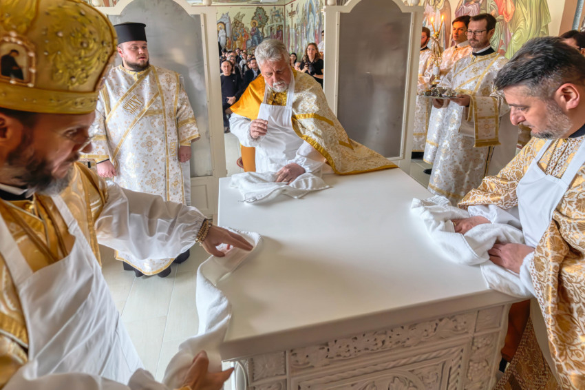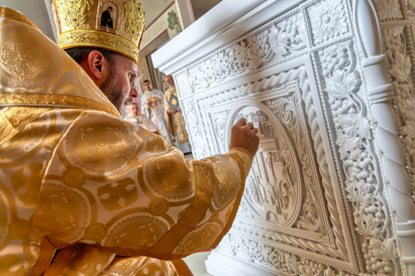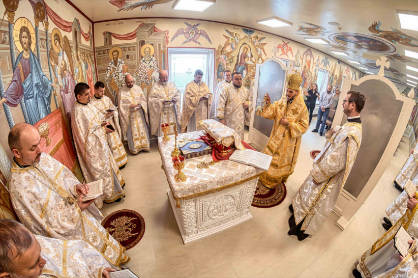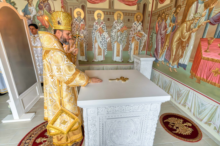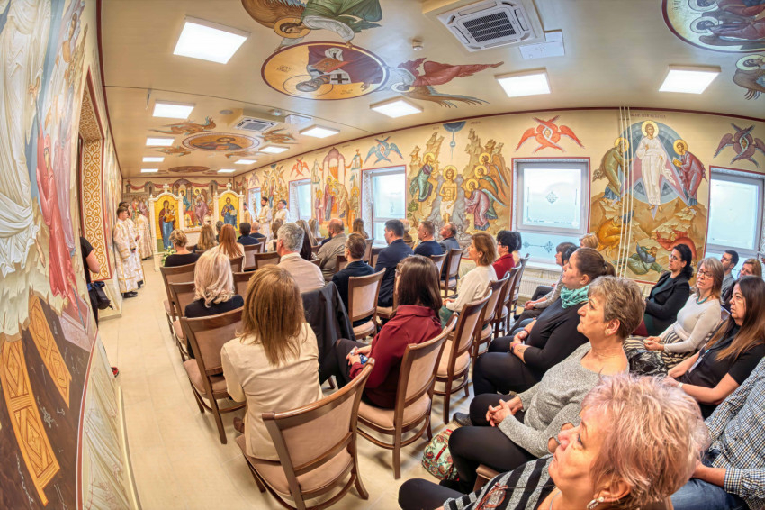 A püspökségi dolgozók heti közös imádságának helyszínt adó liturgikus tér a közelmúltban teljes figurális festést kapott, amelynek befejeztével új oltárt helyeztek el a szentélyben. A keleti hagyomány szerint az oltár Krisztust jelképezi, ezért szentelése különös jelentőséggel bír: a szertartás során a püspök tömjénezéssel, szenteltvízzel és vörösborral vegyített rózsavízzel tisztította meg a felületet, majd miroválta azt. A rítus Krisztus keresztelkedését, áldozatát és sírba tételét szimbolizálja.