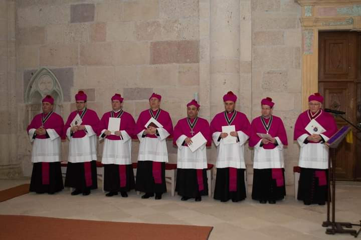 A képen balról jobbra: Veres Stelian őrkanonok, András István mesterkanonok, Hurgoi János, a levéltár őre kanonok, Oláh Zoltán teológuskanonok, Farkas Ervin iskoláskanonok, Kiss Endre éneklőkanonok, László Szabolcs penitenciárius kanonok és Marton József nagyprépost.