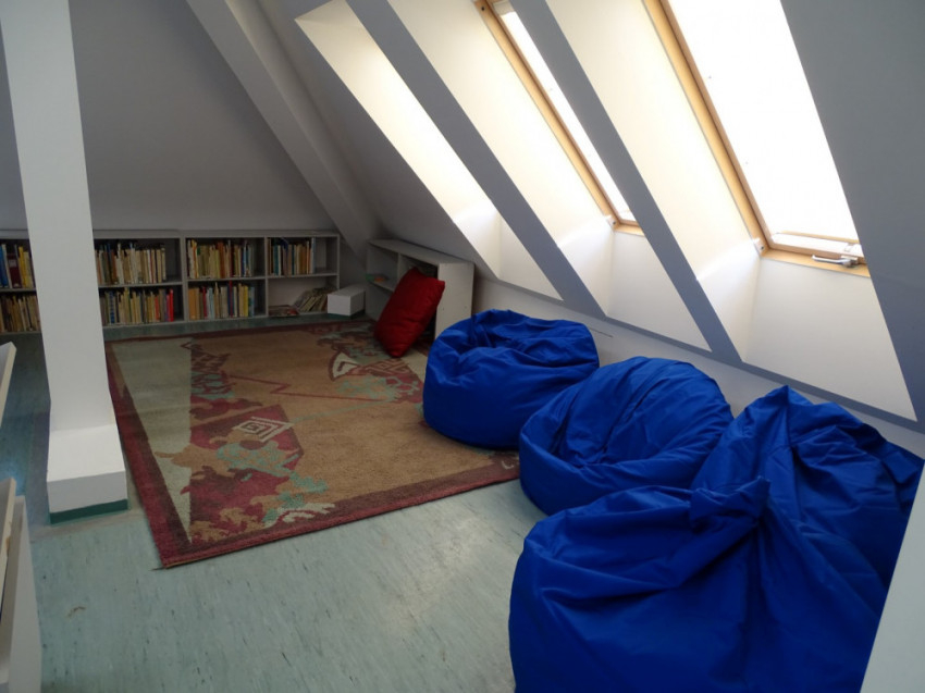 A könyvtárban olvasókuckó fogadja a látogatókat, ahol kényelmes babzsákfotelekben hallgathatnak mesét a kisiskolások.