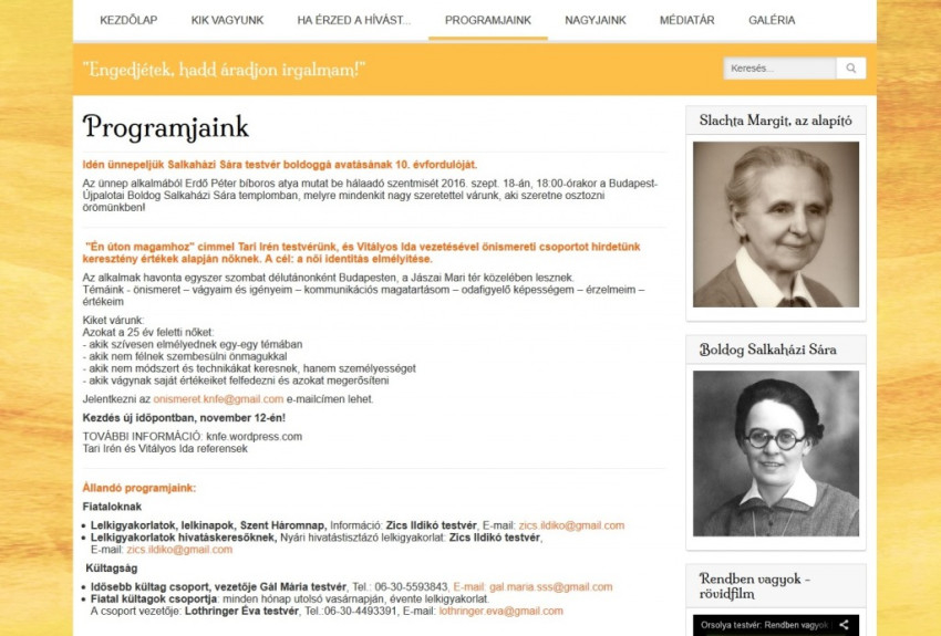 Segítséget nyújtanak hivatástisztázáshoz, tájékoztatnak programjaikról, többek között a lelkinapokról, önismereti kurzusokról. Bemutatják az alapító Slachta Margitot és Boldog Salkaházi Sárát; a „Médiatár”-ban kortárs testvérek és az alapító testvérek írásait találják az érdeklődők.