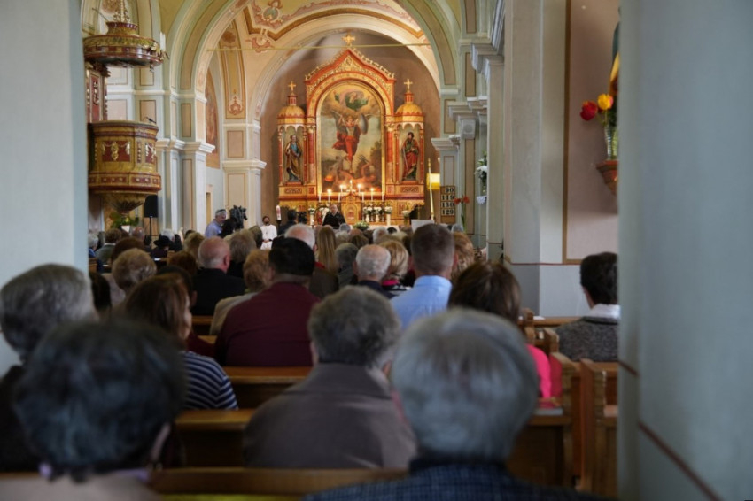 A szentmise végén Schraub Ádám plébános felelevenítette a Szent Mihály-templom felújításának történetét, majd kifejezte háláját, hogy lebontás helyett a megújulás győzedelmeskedett. Köszönetet mondott a kormányzati és egyházi támogatásért, az önkormányzatok támogatásáért, a gyűjtésekből befolyt adományokért, a jótékonysági koncertek keretében és más módon végzett önzetlen szolgálatért, és kifejezte reményét, hogy még sokáig élő hittel, reménnyel és szeretettel ünnepelheti a közösség a köztünk lévő, feltámadt Krisztust a Szent Mihály-templomban.