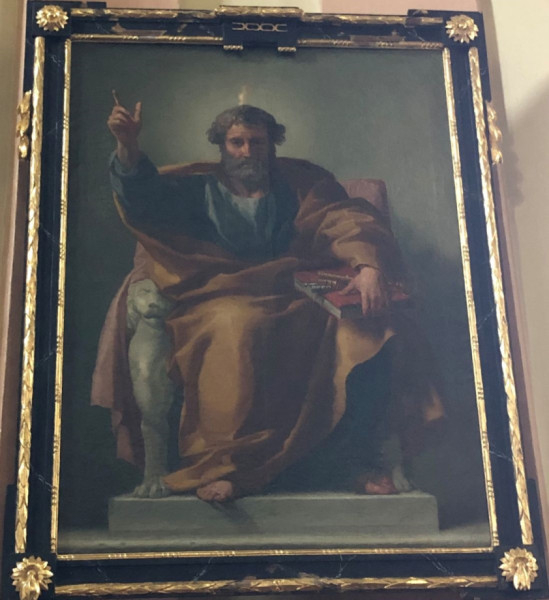 Végül a Szent Pétert trónon ábrázoló festmény került vissza a helyére, melynek eredetijét a templom építésének idején, az 1770-es évek közepén festette Anton Raphael Mengs, több európai uralkodó udvari festője. A szőnyi kép egy jó minőségű korabeli másolat, de az sem teljesen kizárható, hogy a Bécsben és Torinóban őrzött két eredeti változat mellett esetleg a művész egy harmadik alkotása. Akárcsak sok egyéb berendezést, ezt is a templom építettője, gróf Zichy Miklósné Berényi Erzsébet grófnő (Zichy Ferenc győri püspök sógornője) hozatta, feltehetően Bécsből.