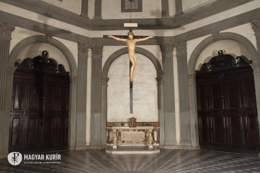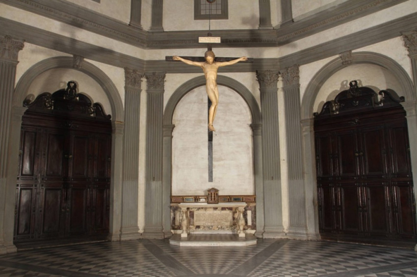 A Krisztust meztelenül ábrázoló 140 centiméteres faszobor eddig egy fal mellett „lapult”, április 4-től azonban az egykori sekrestye kellős közepén, a kupolából lóg alá egy kábelen, hogy körbejárható, minden szögből megtekinthető legyen a reneszánsz remekmű és teljes mértékben érvényesülhessen a fény-árnyék (chiaroscuro) hatás. A keresztre feszített Krisztus szobrát Michelangelo ajándékba adta az Ágoston-rendi szerzeteseknek hálából azért, mert első pártfogója, Lorenzo de’ Medici 1492-es halála után befogadták. A festő és szobrász egy évet töltött a szerzetesek között, akiknél mélyrehatóan tanulmányozhatta az emberi test anatómiáját az általuk működtetett ispotályban.