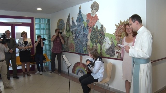 A kacsalábakon forgó palota ablakából egy szépséges királylány tekint ki, és vet pillantást a háromfejű sárkányra… Az Óperenciás-tenger felett seprűnyélen éppen egy boszorkány suhan el… Ezek és még néhány jól ismert mese szereplői – többek között egy óriás és persze a fehér lovon érkező királyfi – és jelenetei elevenednek meg a premontrei gimnázium diákjainak alkotásán. A szombathelyi Markusovszky-kórház Gyermekneurológiai Osztályára érkezőket mostantól ez a színes, több mesét felelevenítő mozaikfal fogadja.