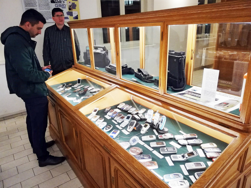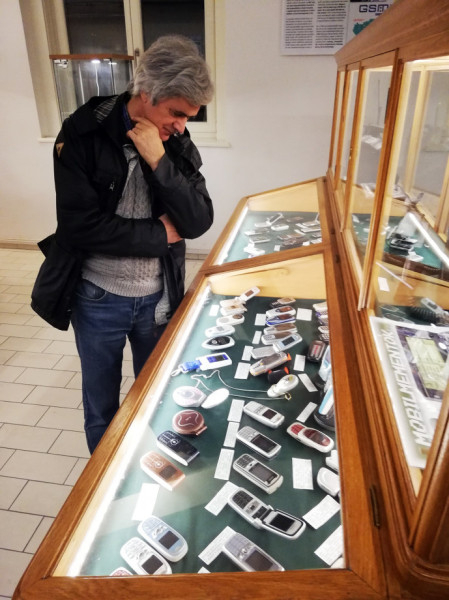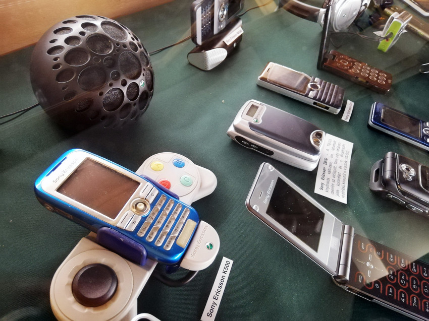 Egy másik vitrinben, sárga-piros kapszulában egy Vodafonos mobil van, egy GSM mobilkészülék 4 MB belső memóriával, 2007-ből. Vannak csúsztatható, kihajtó, sőt tükrös modellek is a hölgyek kedvéért, hogy sminkelni tudják magukat, ha szükséges. Aztán persze vannak itt afféle „bunkofonok”, elég hosszú antennával. Ezek az óriási készülékek Ördögh Zoltán gyűjteményéből valók. Ő a kétezres évek elején kezdte el gyűjteni a mobiltelefonokat, és mára közel 600 darabosra nőtt a kollekciója.