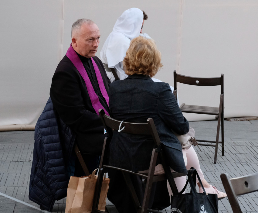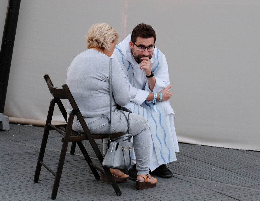 Több pap is itt van, fogadják a gyónni kívánókat. Kovács Zoltán szeged-csanádi egyházmegyés atya is egy közülük, aki fontosnak tartotta, hogy Robert Sarah bíboros miséje után kijöjjön a térre, hogy a hozzá fordulók rendelkezésére álljon.