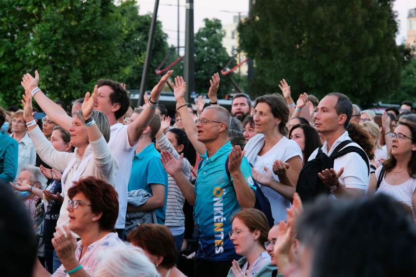 A Széll Kálmán téren, ahogy esteledik, egyre nagyobb a metró bejáratával szemben felállított színpad előtt a tömeg. A munka után hazaindulókat meg-megállítja a zene. A Makám és a Kaláka gyerekműsorai, dicsőítő zenekarok, Csiszér László, Pintér Béla, az Eucharist, Martin Dorka és csapata, a Szabad-On együttes, a Golgota Gospel sok embert vonzanak, „így könnyebben megállnak olyanok is, akik láthatóan nem tudják hova tenni a dolgot” – magyarázza Végh Zoltán, a Magyar Katolikus Karizmatikus Megújulás elnöke, a Széll Kálmán téri színpad koordinátora.